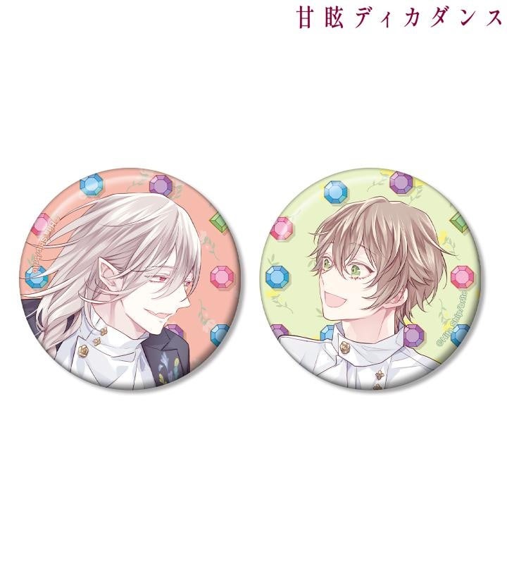 緋汰しっぷ先生描き下ろしイラストのロズ、ユイネをお花と宝石風の飾りと組み合わせ、缶バッジ2個セットに仕上げました。