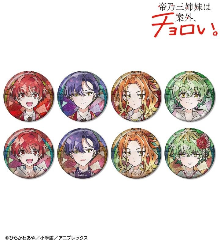 綾世 優、帝乃 一輝、帝乃 二琥、帝乃 三和のイラストを新たなタッチで魅力的に表現し、グリッター加工を施した缶バッジに仕上げました。