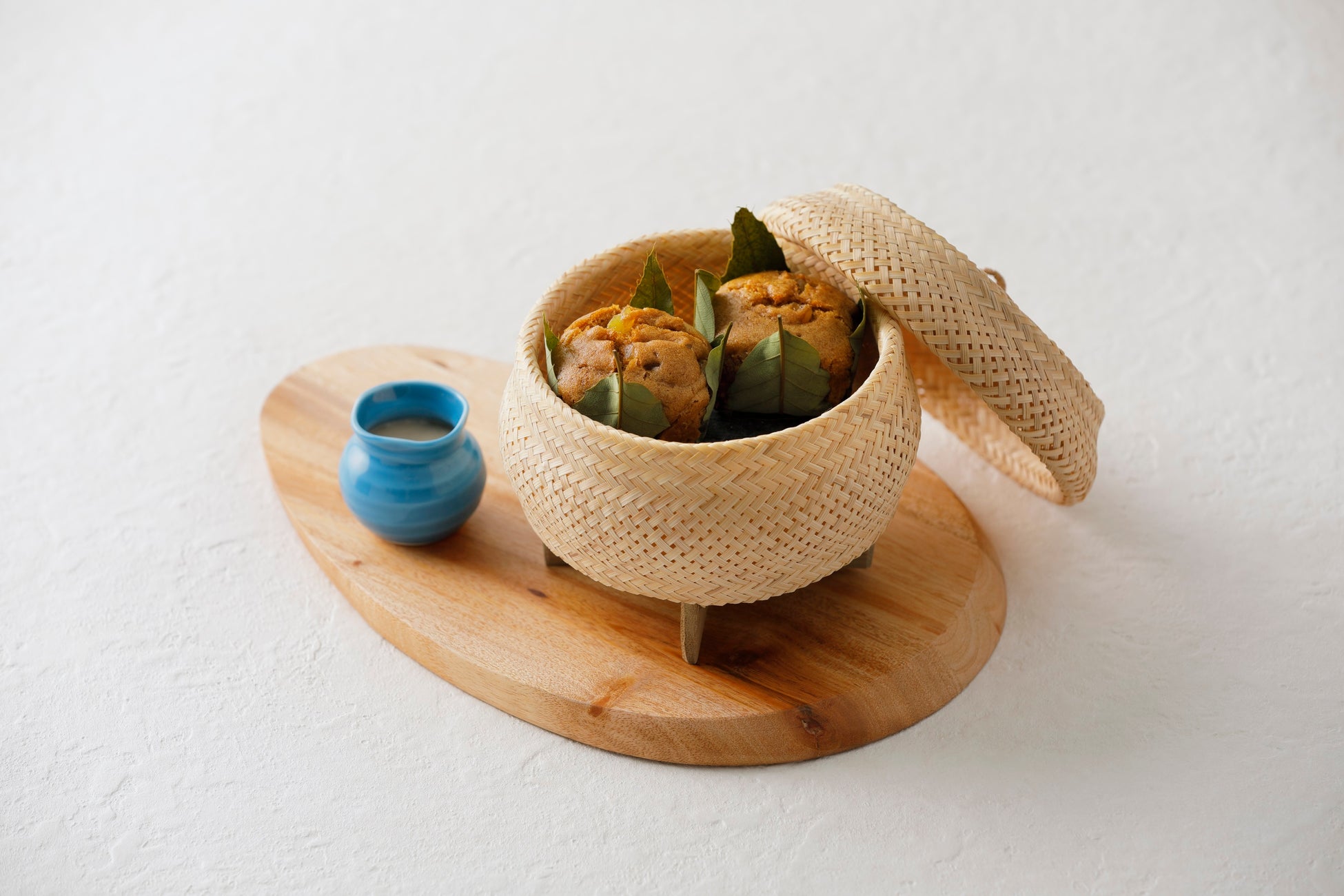 ■商品説明:ココナッツミルクが香るカンボジアの伝統的な蒸しケーキで和栗あんをたっぷり包み、栗の葉で巻きました。