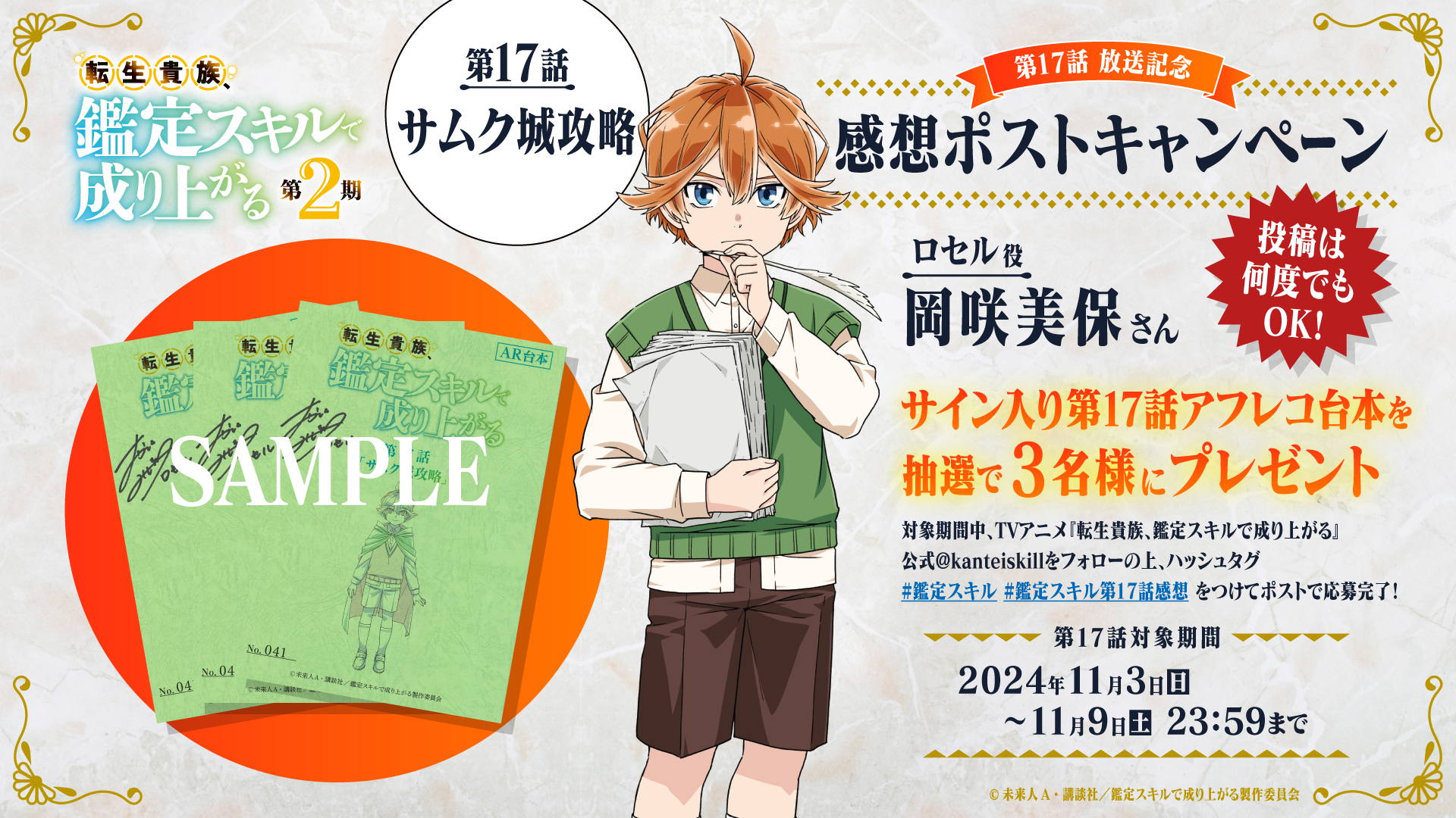 TVアニメ『転生貴族、鑑定スキルで成り上がる 第2期』第17話(第2期5話目)放送を記念して、ロセル・キーシャ役 岡咲美保さんのサイン入り第17話台本を、3名様にプレゼントいたします。