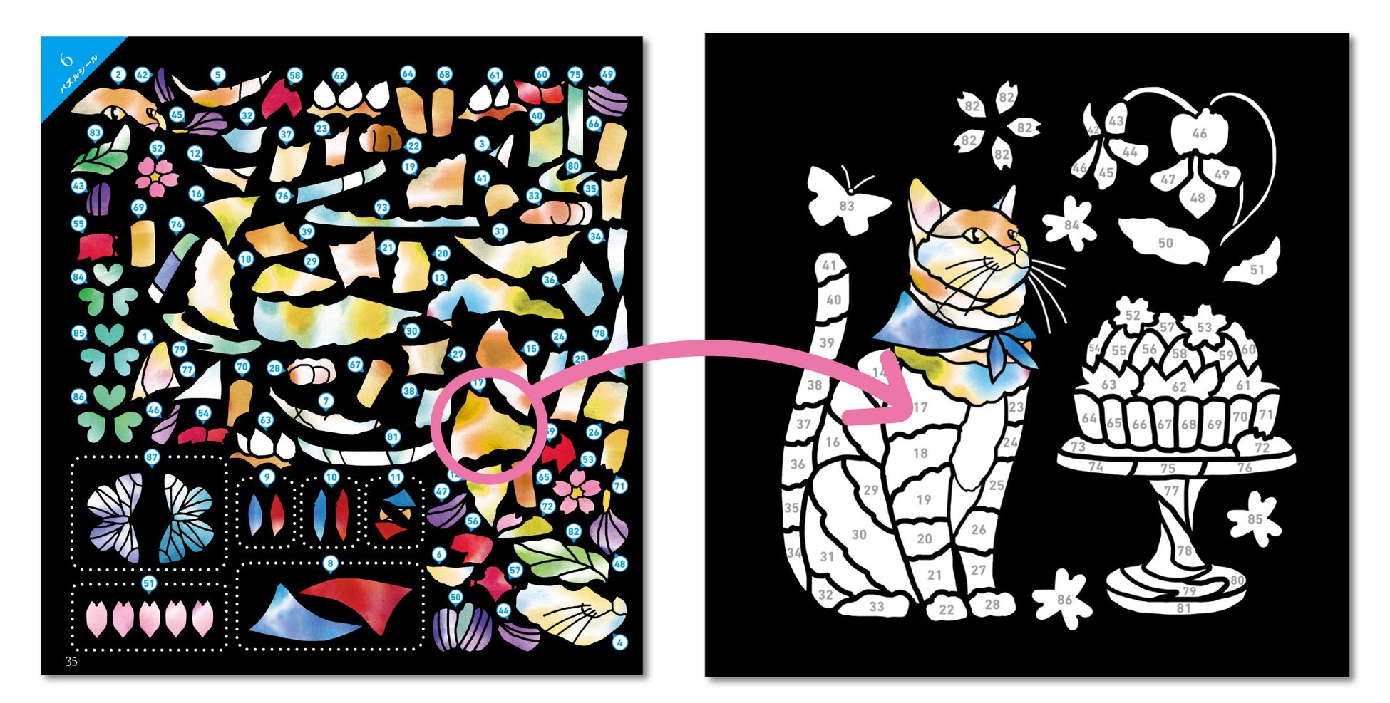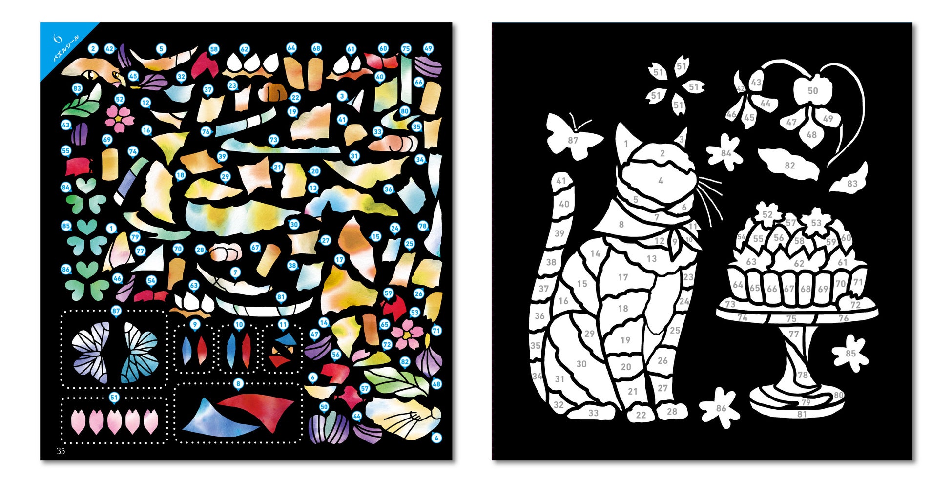 本書は、真っ黒な背景に美しいシールをはって、ステンドグラス風のイラストを完成させるシールパズルです。道具がいらないので、いつでもどこでも気軽に始められます。