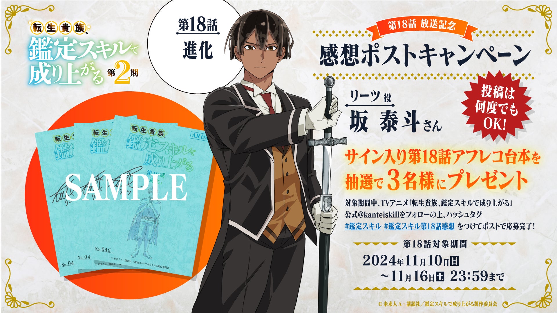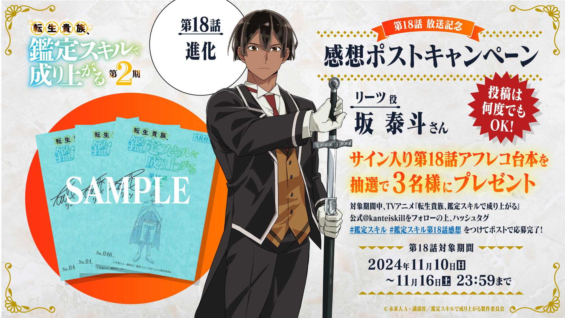 TVアニメ『転生貴族、鑑定スキルで成り上がる 第2期』第18話(第2期6話目)放送を記念して、リーツ・ミューセス役 坂 泰斗さんのサイン入り第18話台本を、3名様にプレゼントいたします。