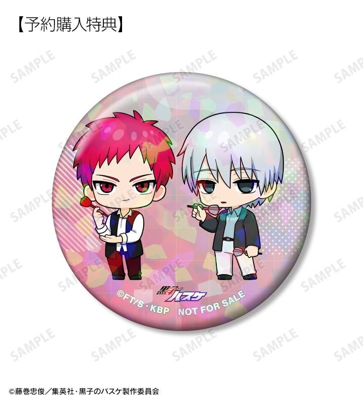 黒子テツヤ、火神大我、テツヤ2号、黄瀬涼太、笠松幸男、緑間真太郎、高尾和成、青峰大輝、桃井さつき、紫原 敦、氷室辰也、赤司征十郎、黛 千尋、花宮 真の描き起こしちびキャライラストをメインにデザインし、ホログラム加工を施した缶バッジに仕上げました。