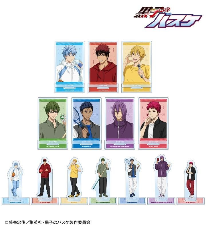 黒子テツヤ、火神大我、テツヤ2号、黄瀬涼太、笠松幸男、緑間真太郎、高尾和成、青峰大輝、桃井さつき、紫原 敦、氷室辰也、赤司征十郎、黛 千尋、花宮 真の描き起こしちびキャライラストをメインにデザインし、アクリルスタンドに仕上げました。
