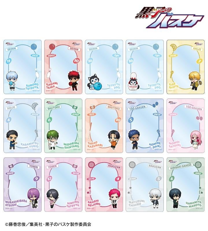 黒子テツヤ、火神大我、テツヤ2号、黄瀬涼太、笠松幸男、緑間真太郎、高尾和成、青峰大輝、桃井さつき、紫原 敦、氷室辰也、赤司征十郎、黛 千尋、花宮 真の描き起こしちびキャライラストをメインにデザインし、クリアカードに仕上げました。