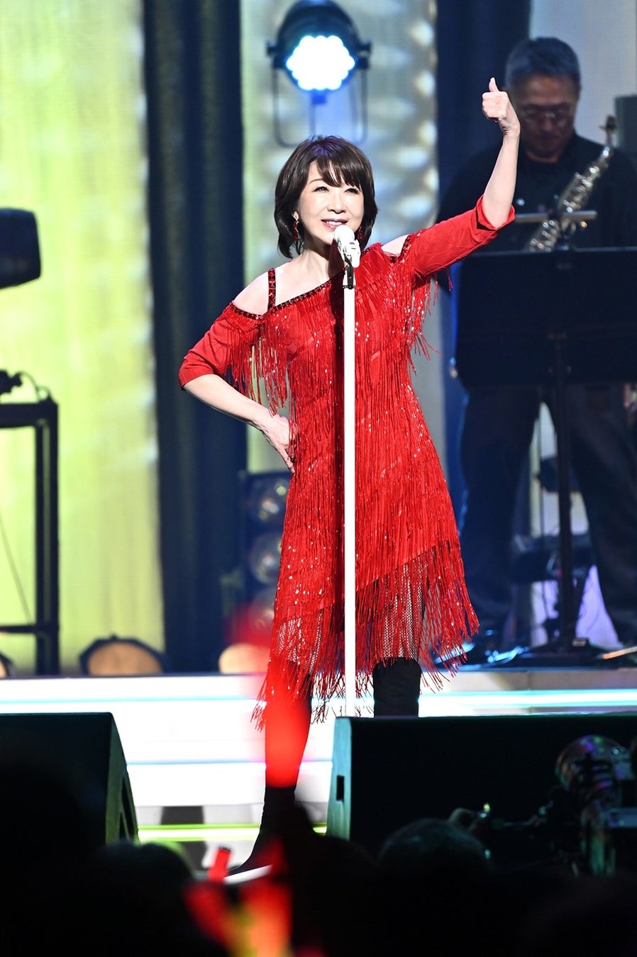 爆発的な「ランちゃんコール」が交差する中、再会の喜びを分かち合うMCの後は、はやくもキャンディーズ・ナンバーへ。大ヒットシングル「アン・ドゥ・トロワ」「やさしい悪魔」の2曲はモダンなリアレンジで、懐かしさに新たなスパイスを加える。「銀河系まで飛んで行け!」はオリジナルヴァージョンで披露し、会場を1977年にタイムワープさせる。いずれも吉田拓郎が提供した作品だ。歌い終えた彼女は「3曲とも大好きな曲です」と笑顔を見せる。