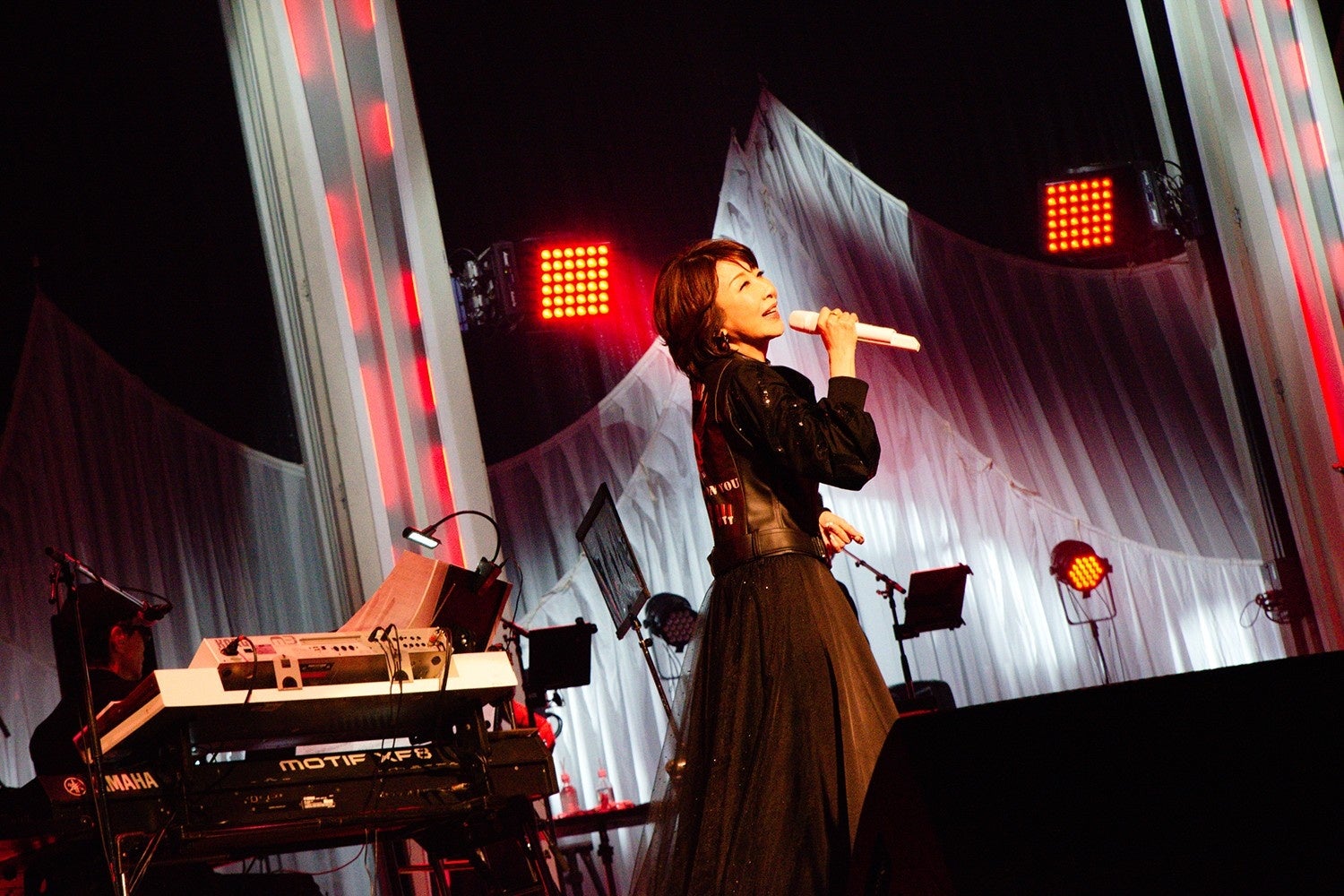 定刻を少し過ぎると、場内が暗転。骨太なバンド演奏からハードロック調のサウンドが凛々しい「ICE ON FIRE」へ。舞台中央奥から登場した彼女は、黒のライダースジャケット姿。森雪之丞が描いたアダルトかつクールな世界を歌い上げる。2曲目はファースト・ソロ・シングル「恋するリボルバー」。疾走感あふれるコンサートの定番曲に、真っ赤なペンライトを振って応えるオーディエンス。ハートはすでに着火済だ。続く「なみだは媚薬」は、“大人可愛い”横揺れのグルーヴィーな1曲。タイプの異なる楽曲を紡ぐことで、ソロシンガーとしての魅力をまざまざとみせつける。