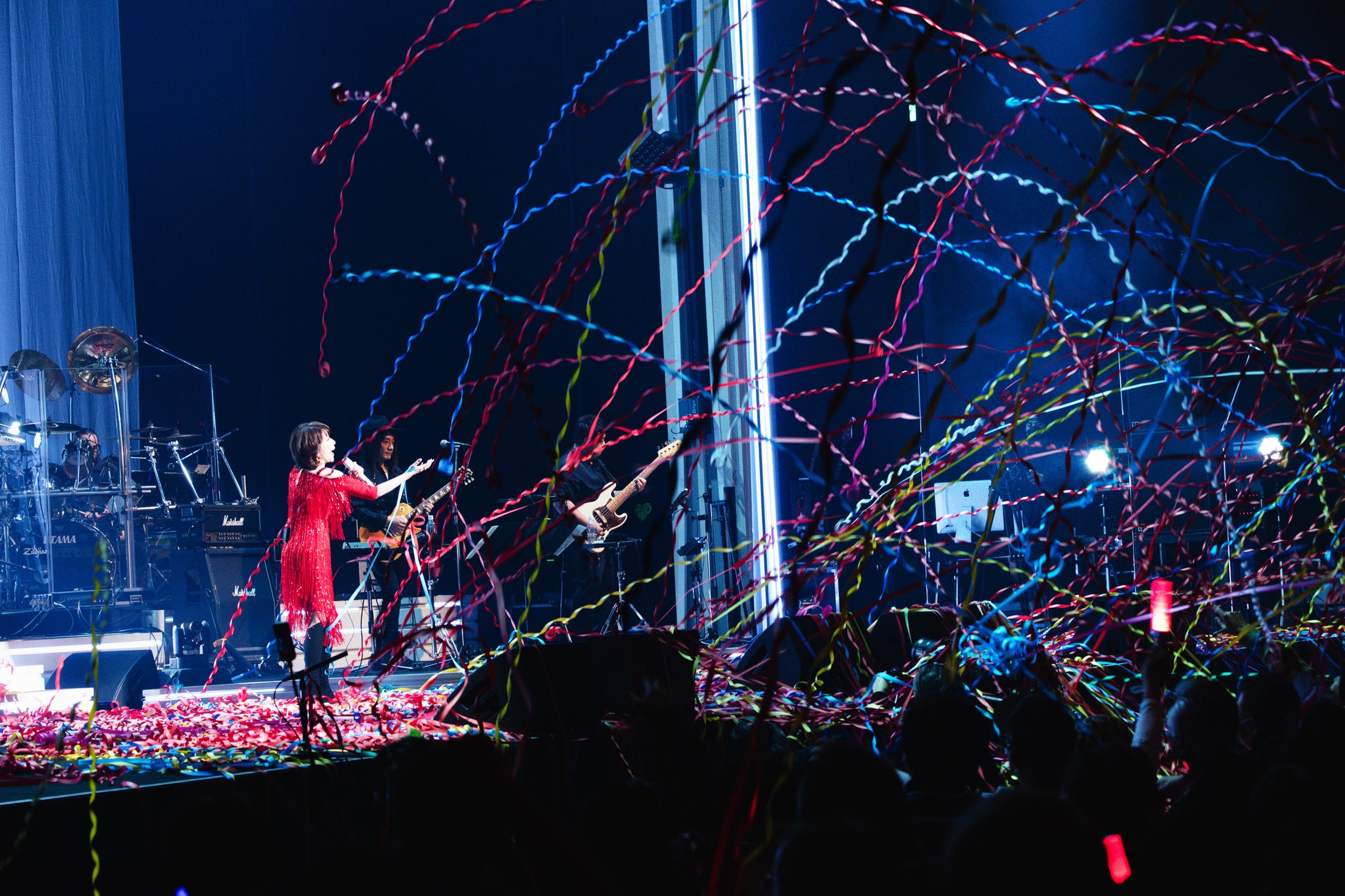 圧巻は、紙テープ投げ入れが解禁された「哀愁のシンフォニー」だった。メンバーカラーの赤、青、黄色の紙テープが客席からステージに次々と投げ込まれていく。いつまでも胸に残るであろう荘厳な風景。紙テープが放つ美しい軌跡が、時間と空間を超えてあの頃と現在を繋げていくようにも見えた。本編最後はキャンディーズの“ラストシングル”「微笑がえし」。あふれ出る思いに、胸の震えが止まらなかった。