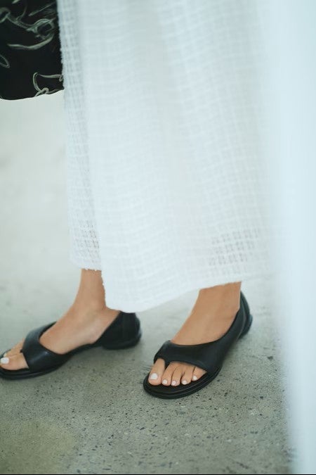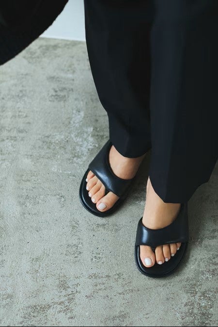 パッと見はオープントゥのフラットシューズのようにも見えて、実はトングっていうところがいい。ボリュームがあるのに、つま先が出ていて軽やかに見えるデザインも絶妙です。
