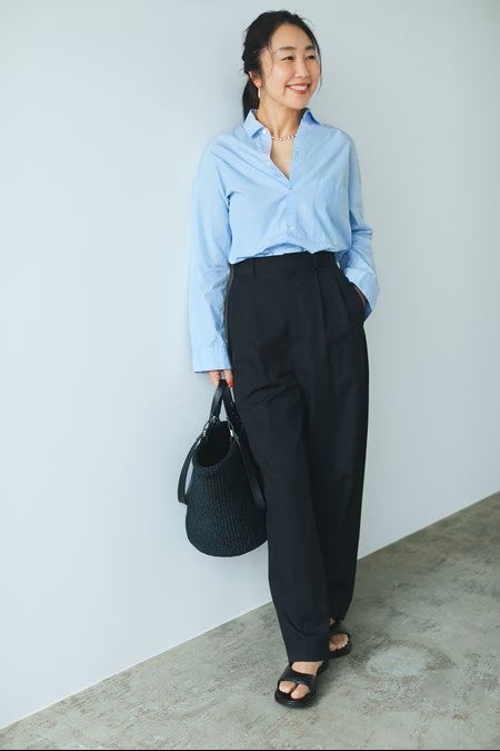 足の甲や足指が出ることで黒パンツの足元に抜け感が生まれ、程良くリラックスした雰囲気に仕上がります。