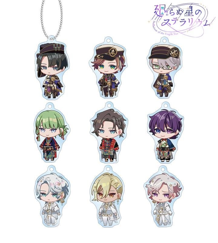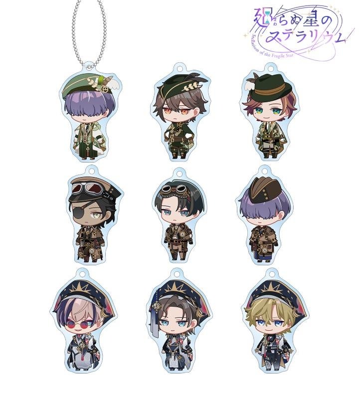 『舞う湖畔のフォークロア』ユージン、ミゲル、サルース、『輝夜の宴で夢を咲かせて』アムル、クラン、マニ、『錬金人形は永遠の夢を見る』ゼタ、カシム、アルのちびキャライラストをアクリルキーホルダーに仕上げました。