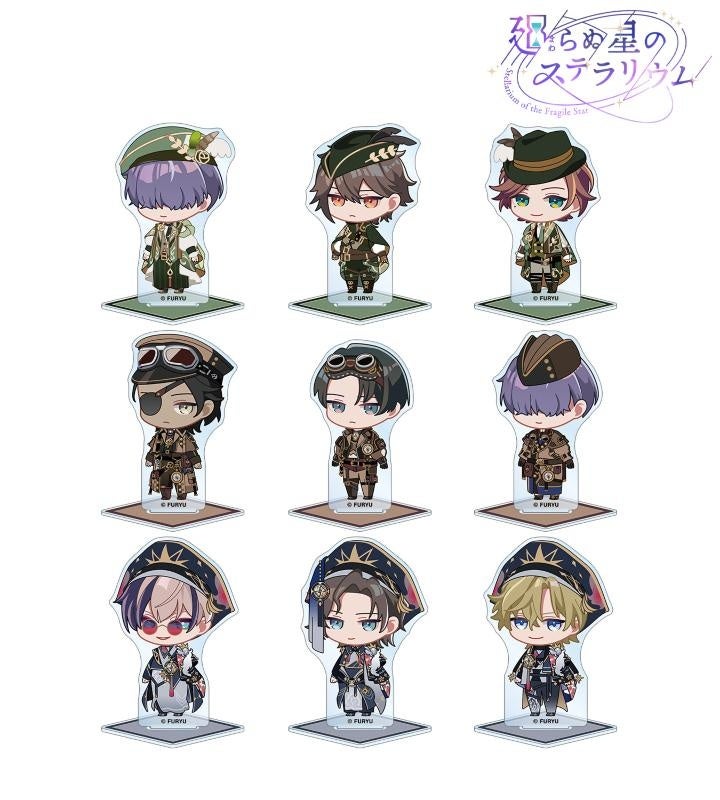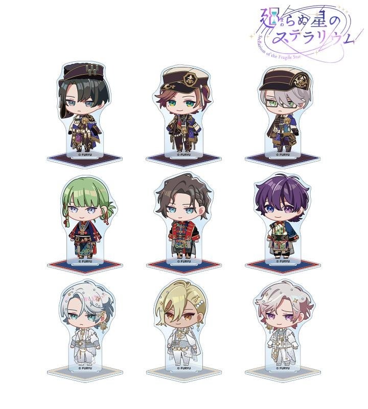 『舞う湖畔のフォークロア』ユージン、ミゲル、サルース、『輝夜の宴で夢を咲かせて』アムル、クラン、マニ、『錬金人形は永遠の夢を見る』ゼタ、カシム、アルのちびキャライラストをアクリルスタンドに仕上げました。