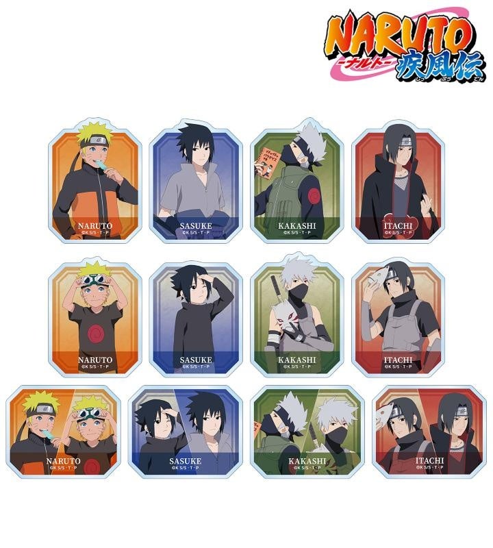 うずまきナルト、うちはサスケ、はたけカカシ、うちはイタチの描き下ろしイラストをアクリルスタンドに仕上げました。