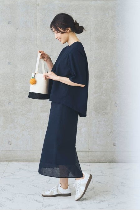 今回で3回目となるコラボに選んだアイテムは、ネイビーを愛する山根さんこだわりの “大人ネイビー” で作った、上品なのに親しみやすさもあるブラウスとスカート。