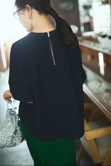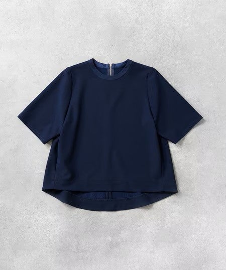体のラインを拾いにくく、着るだけでスッキリシルエット。肘にかかる長めの半袖デザインが、モタモタしてきた肩のラインや二の腕をしっかり隠し、後ろにかけて長くなるラウンドヘムが、腰まわりやお尻を自然にカバーしてくれます。