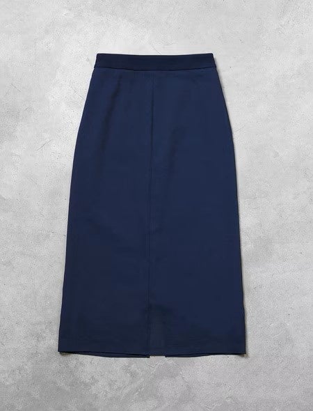 一見、ベーシックなネイビーのタイトスカートに見えて、実は二重構造になったこだわりの一枚。ブラウスと同じジョーゼット素材のスカートの上に、リネンライクなシアー素材を重ねています。