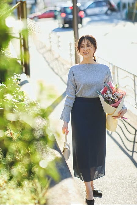山根さんの “好きの基本” である、『首が詰まり気味の袖ありブラウス』、『ミモレ丈タイトスカート』 に立ち返った、山根さんらしいアイテムが完成しました。