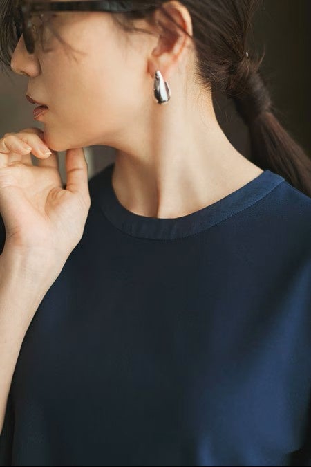 首元にはシアー素材を二重にあしらいアクセントに。Tシャツのようなデザインも、このあしらいがあることで華やぎも加わり、生地のほのかなツヤ感も相まって、さらっと一枚で着ても大人の品格をキープしてくれます。