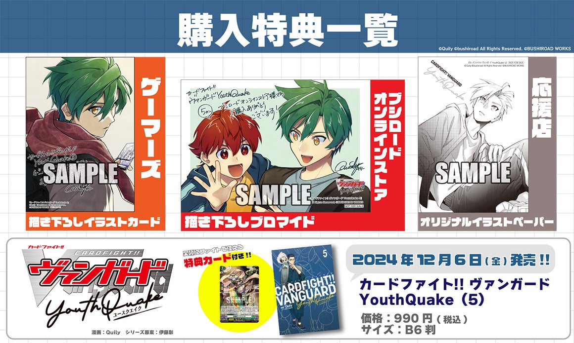 2011年1月の誕生から10年以上の人気を誇る、ブシロードのトレーディングカードゲーム「カードファイト!! ヴァンガード」。『カードファイト!! ヴァンガード YouthQuake』は、その原作者・伊藤彰先生と、スピンオフコミック『みにヴぁん』作者・Quily先生が贈る、等身大の主人公が仲間たちとファイトするヴァンガードのオリジナル漫画です!!