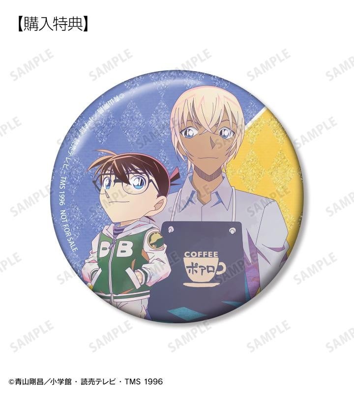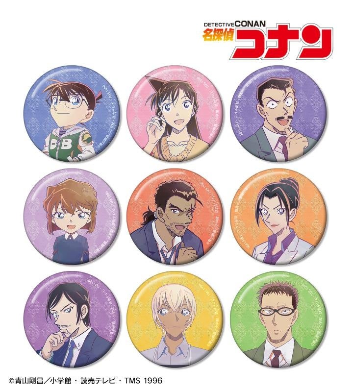 江戸川コナン、毛利蘭、毛利小五郎、灰原哀、大和敢助、上原由衣、諸伏高明、安室透、風見裕也のイラストを新たなタッチで魅力的に表現し、グリッター加工を施した缶バッジに仕上げました。