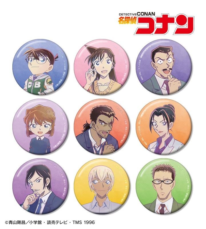 江戸川コナン、毛利蘭、毛利小五郎、灰原哀、大和敢助、上原由衣、諸伏高明、安室透、風見裕也のイラストを新たなタッチで魅力的に表現し、缶バッジに仕上げました。