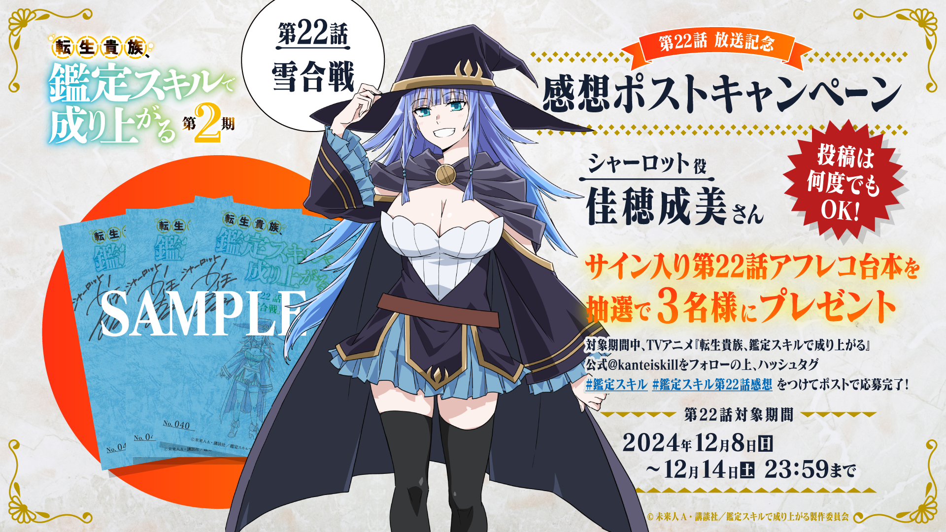 TVアニメ『転生貴族、鑑定スキルで成り上がる 第2期』第22話(第2期10話目)放送を記念して、シャーロット・レイス役 佳穂成美さんのサイン入り第22話台本を、3名様にプレゼントいたします。