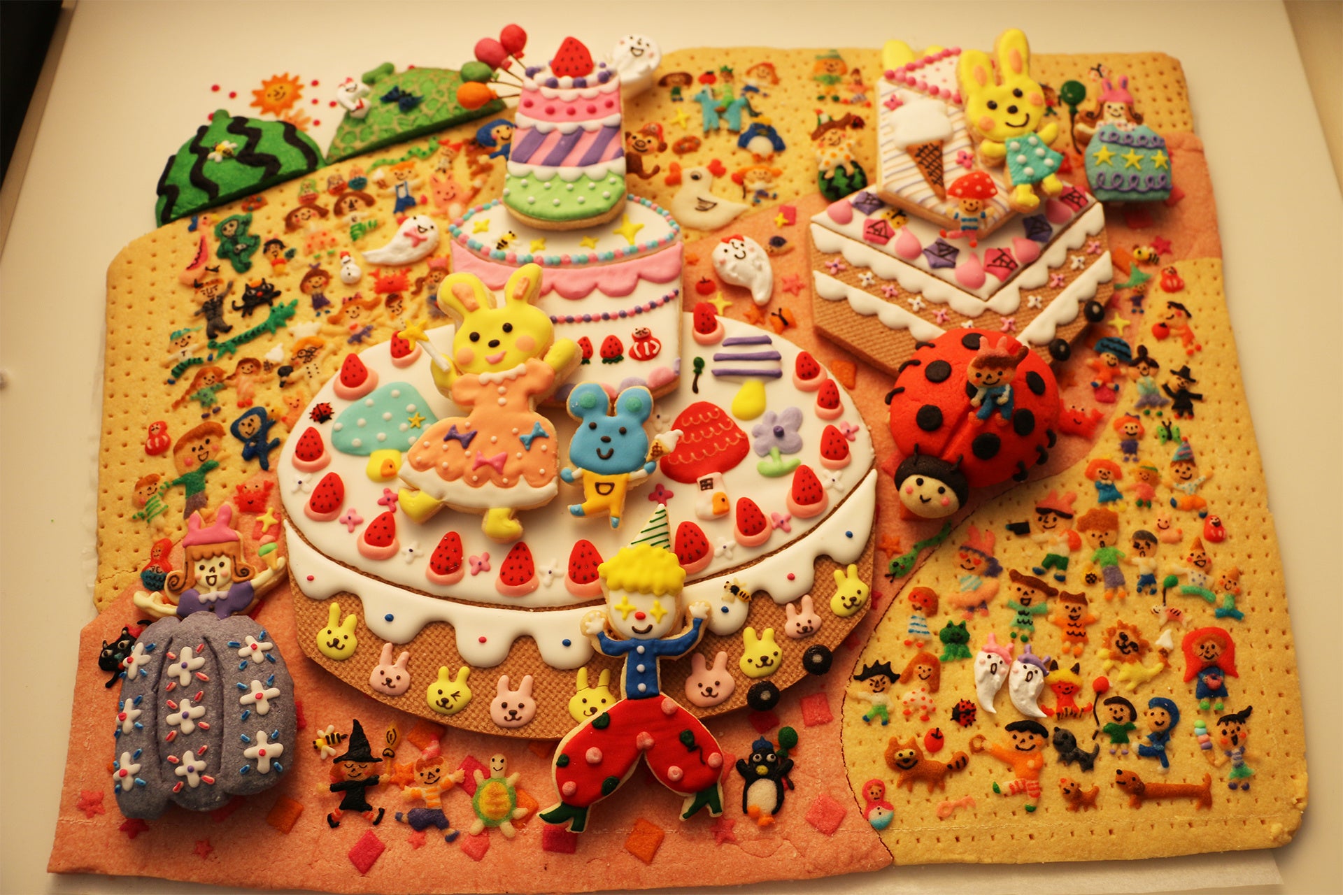 原画は普通なら絵の具や色鉛筆で描くところを、クッキーやスポンジ、メレンゲなど“本物のおかし”で作られています。絵本と同じサイズになるように、一つ一つのお菓子がとても細かく作り込まれているのが大きな見どころ。絵本で見るよりも、実際の作品では立体感を感じていただけます。