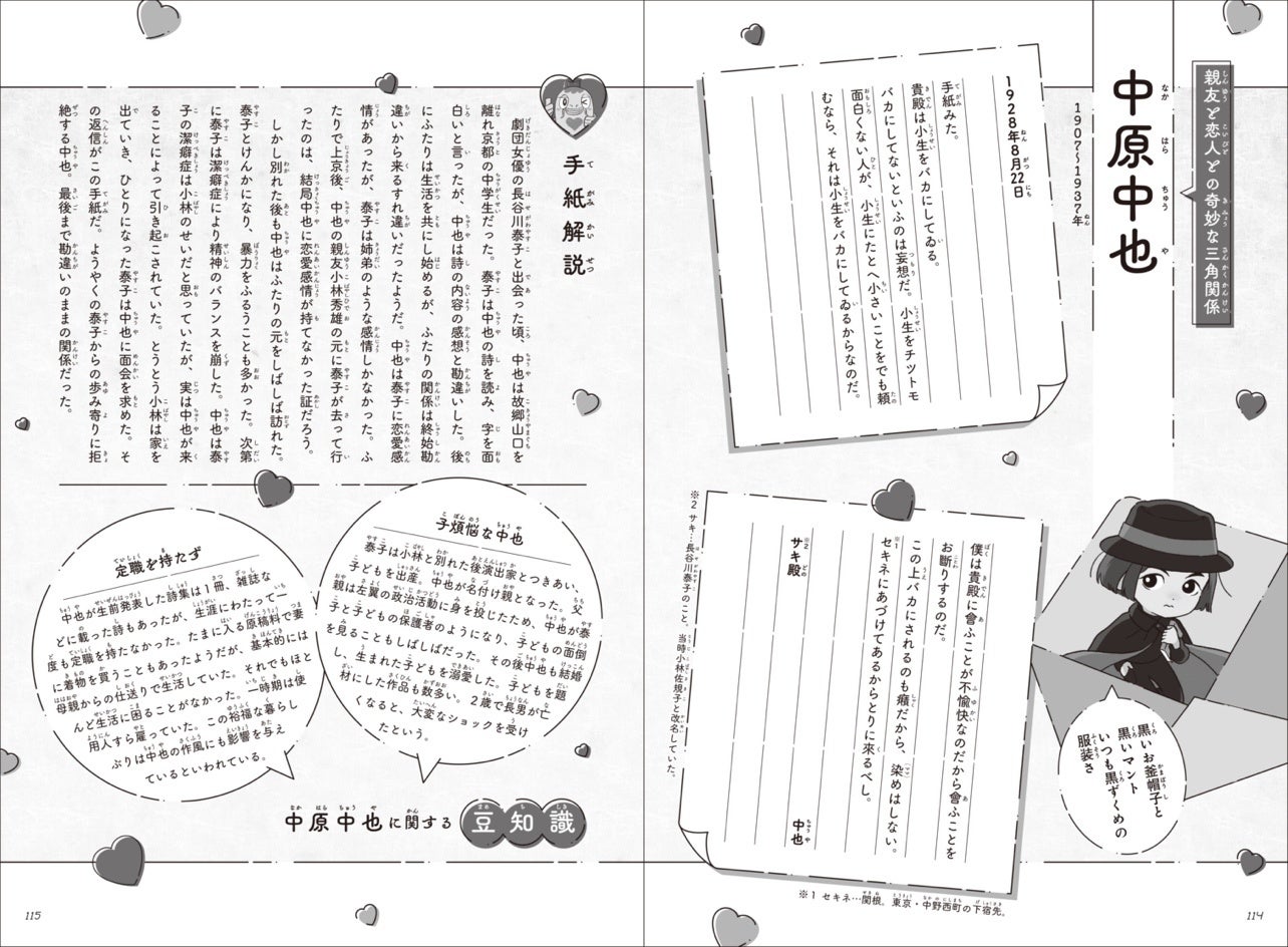 つい最近映画にもなり、今なお人気の詩人・中原中也も取り上げています。恋文というにはあまりにもひねくれた内容ですが、それだけに、よけいに中原中也の魅力が伝わる内容になっています。