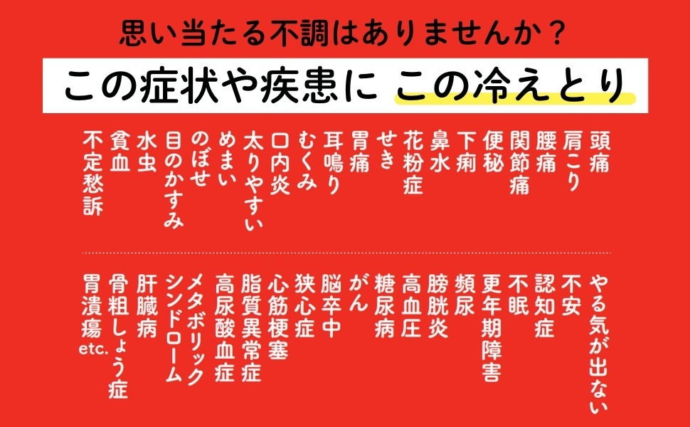 頭痛・肩こり・腰痛・関節痛・便秘・下痢・鼻水・花粉症・せき・胃痛・耳鳴り・むくみ・口内炎・太りやすい・めまい・のぼせ・目のかすみ・水虫・貧血・不定愁訴・やる気が出ない・不安・認知症・不眠・更年期障害・頻尿・膀胱炎・高血圧・糖尿病・がん・脳卒中・狭心症・心筋梗塞・脂質異常症・高尿酸血症・メタボ・肝臓病・骨粗しょう症・胃潰瘍 etc.