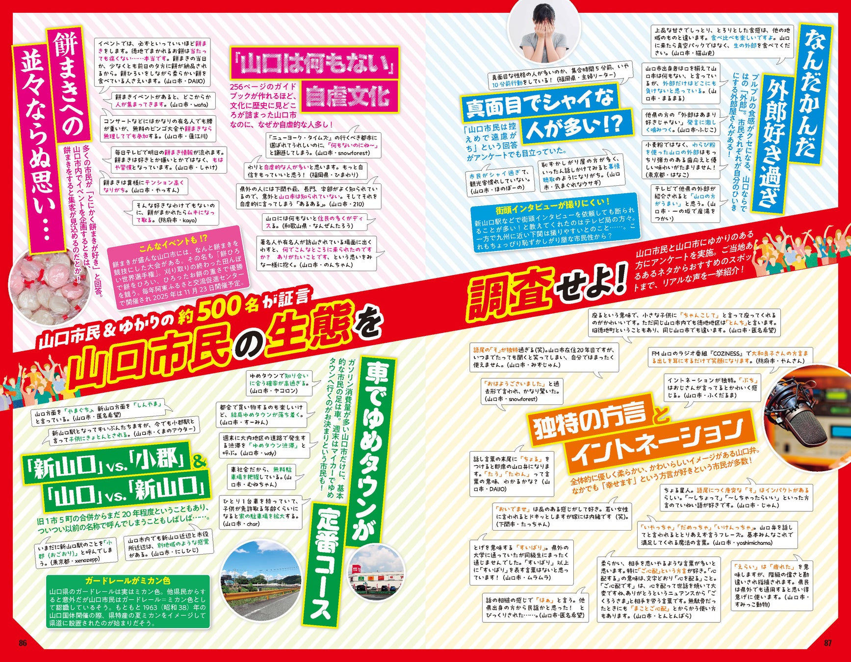 市民の方はもちろん、山口市にルーツがある方、旅で訪れたことがある方など、約500名から市のおすすめを募集。それらの声を紙面でもクチコミとして多数紹介しています。なかでも、市民のみなさんから集めた「山口市あるある」や、市内の大学に通う学生が推すおすすめスポット、普段から地元で取材を続けるメディアへのインタビュー企画は必読!