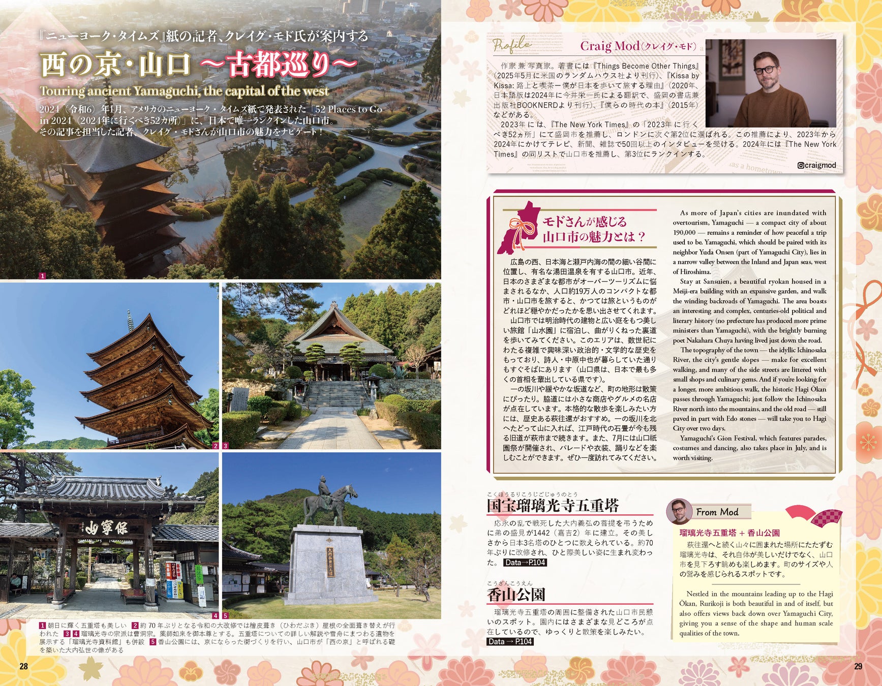 大内文化が花開いた室町時代や、維新の策源地となった幕末から明治など、さまざまな時代の面影を感じることができる山口市では、古都スポット巡りが欠かせません。国宝の瑠璃光寺や山口サビエル記念聖堂など、歴史的・文化的背景とともに各所を詳しく紹介しています。また、国内版の人気記事である歴史年表や、市ゆかりの文人紹介など、見逃せない特集を多数掲載しています。