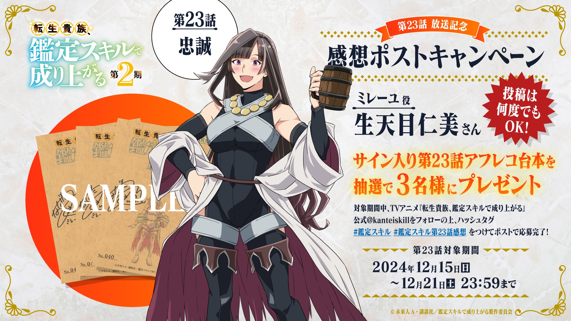 TVアニメ『転生貴族、鑑定スキルで成り上がる 第2期』第23話(第2期11話目)放送を記念して、ミレーユ・グランジオン役 生天目仁美さんのサイン入り第23話台本を、3名様にプレゼントいたします。