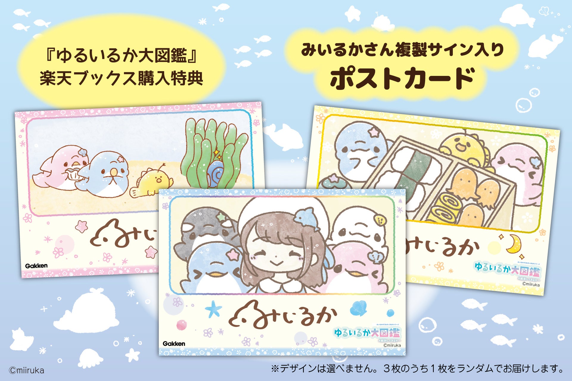 楽天ブックスでは、『ゆるいるか大図鑑』だけのオリジナルイラストを使用した、複製サイン入りポストカードの購入特典を、ランダム3種の中から1枚お届けします。お部屋のインテリアやコレクション、メッセージカードとしてもおすすめのデザインです。