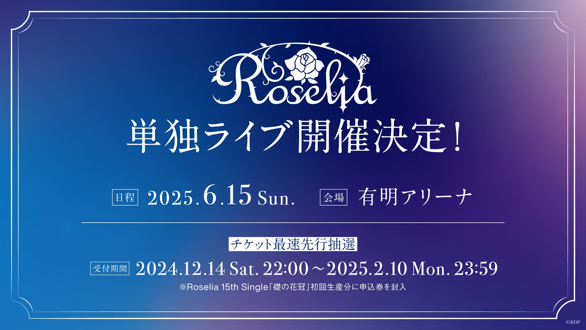 チケットの最速先行抽選が、12月14日(土) 22時より受付開始予定です。申込券はRoselia 15th Single「礎の花冠」の初回生産分に封入されています。