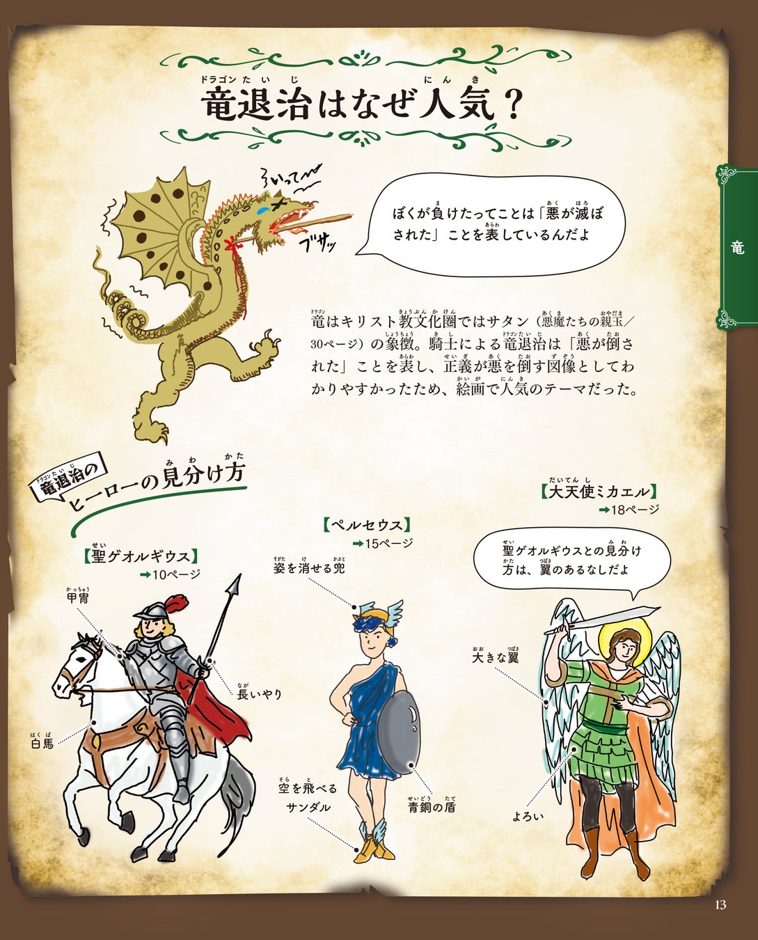 モチーフになったかいぶつや周辺人物の紹介とともに、描かれているものは絵画の上に書き込むような形で解説しています。視覚的にわかりやすく、西洋絵画を難しく感じるお子さまにも馴染みやすい本になっています。