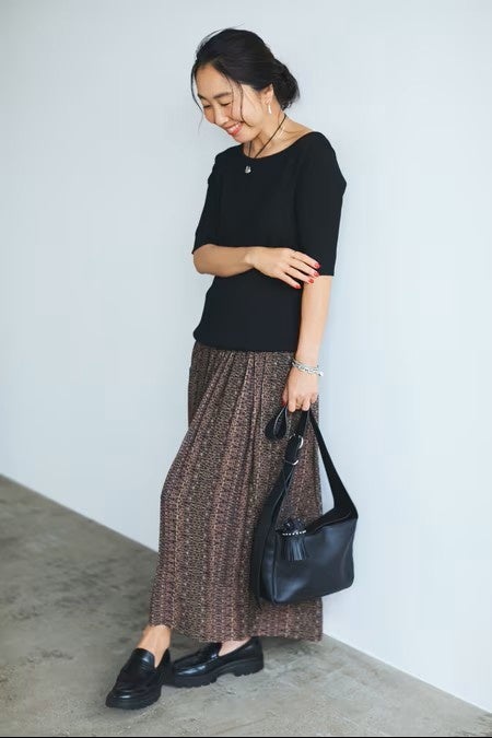 黒トップスには柄スカートを合わせて。インパクトのある柄ボトムに程良いフィット感の五分袖トップスが品と優しいムードを添えてくれます。カッティングが女性らしいので、ローファーやレザーのスクエアバッグでちょっとマニッシュな要素をプラスしてバランスをとりました。
