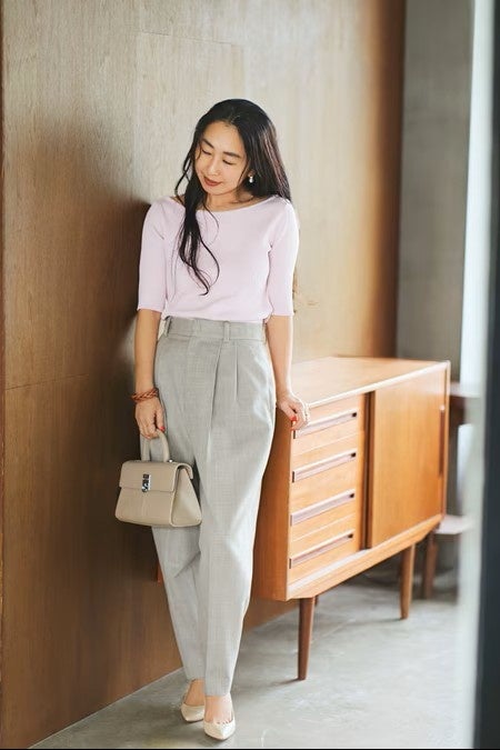 今季、“きれい色”に心惹かれてつくった大人のための優しいピンク。その優しい色みをいかして、全身明るい色のトーンでまとめてみました。ハイウエストのベージュパンツに、靴やバッグもベージュで統一。お仕事にも行けそうなきれいめコーデです。