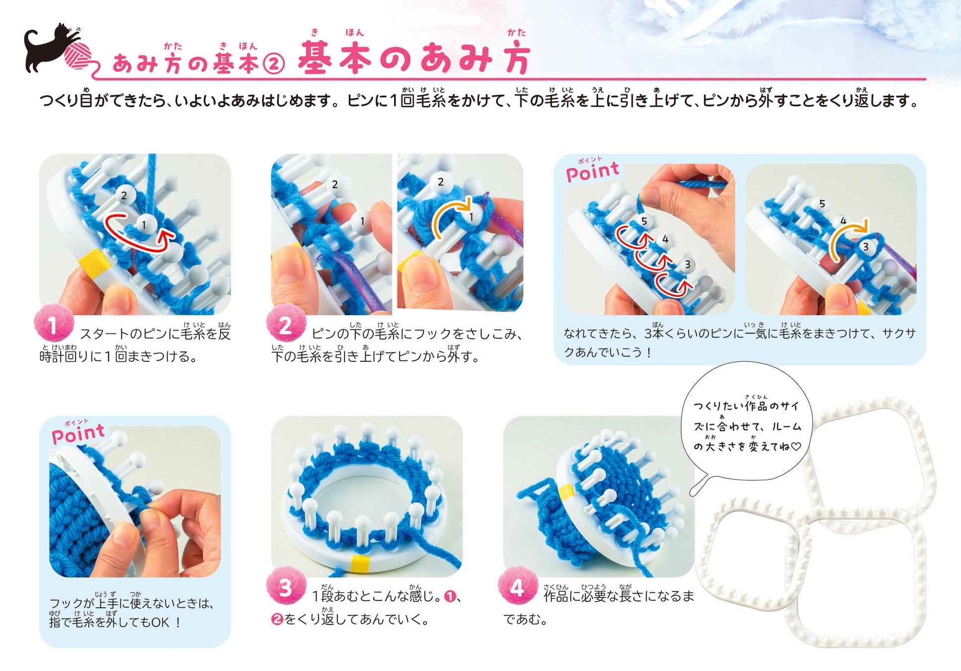 シリーズ累計発行部数58万部超えの大人気シリーズ「ガールズクラフト」に、かんたん編み機がついたキットが登場! 帽子やポシェット、ブレスレットなどのかわいい小物が4種類つくれる、2種類の毛糸がたっぷりついています。