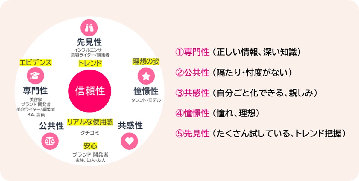 またその中で発信者を単なる人気ではなく、「専門性」「公共性」「共感性」「憧憬性」「先見性」という5つの軸で評価し、商品カテゴリーや自身の悩みレベルに応じて、どの「軸」の情報を重視して裏取りを行うかが体系化されている現状を分析しました。