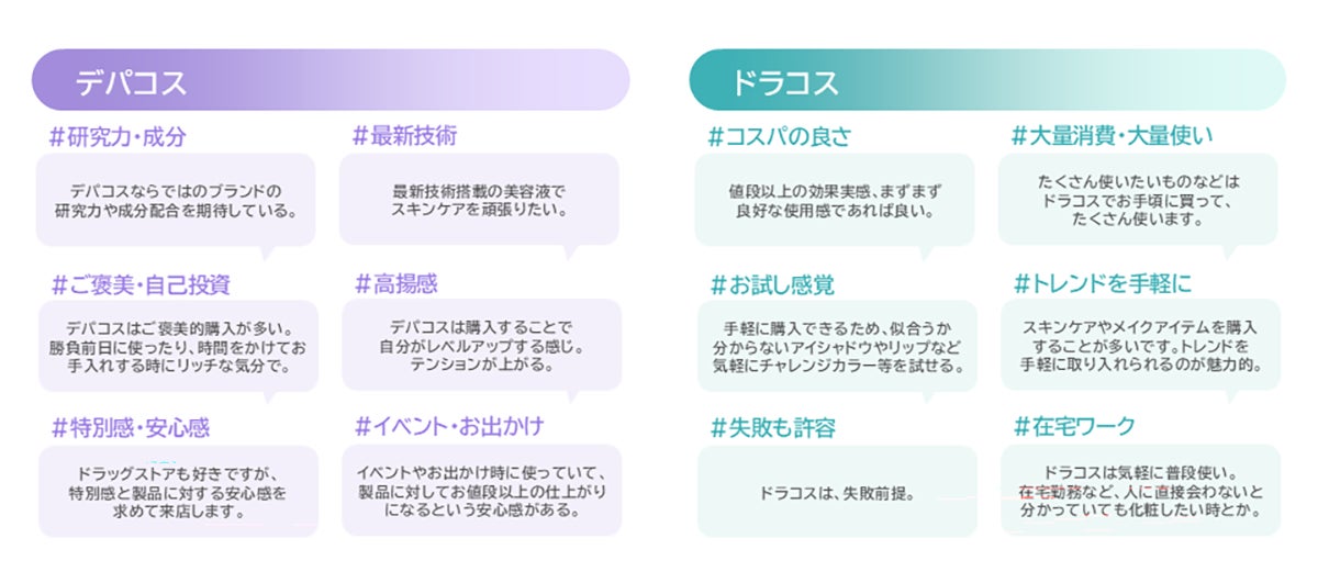 「失敗を避けたい」心理が強く働くデパコスでは、専門家による「科学的根拠」と、自分に近いユーザーの「実体験」という、対極にある情報のセットが確証の決め手となります。一方、ドラコスでは情報の「鮮度」と「瞬発的な共感」が検証のポイントとなっており、カテゴリーごとに購買スイッチが明確に分かれています。