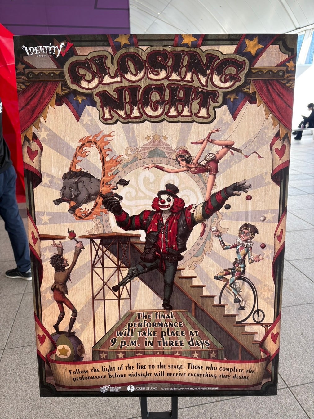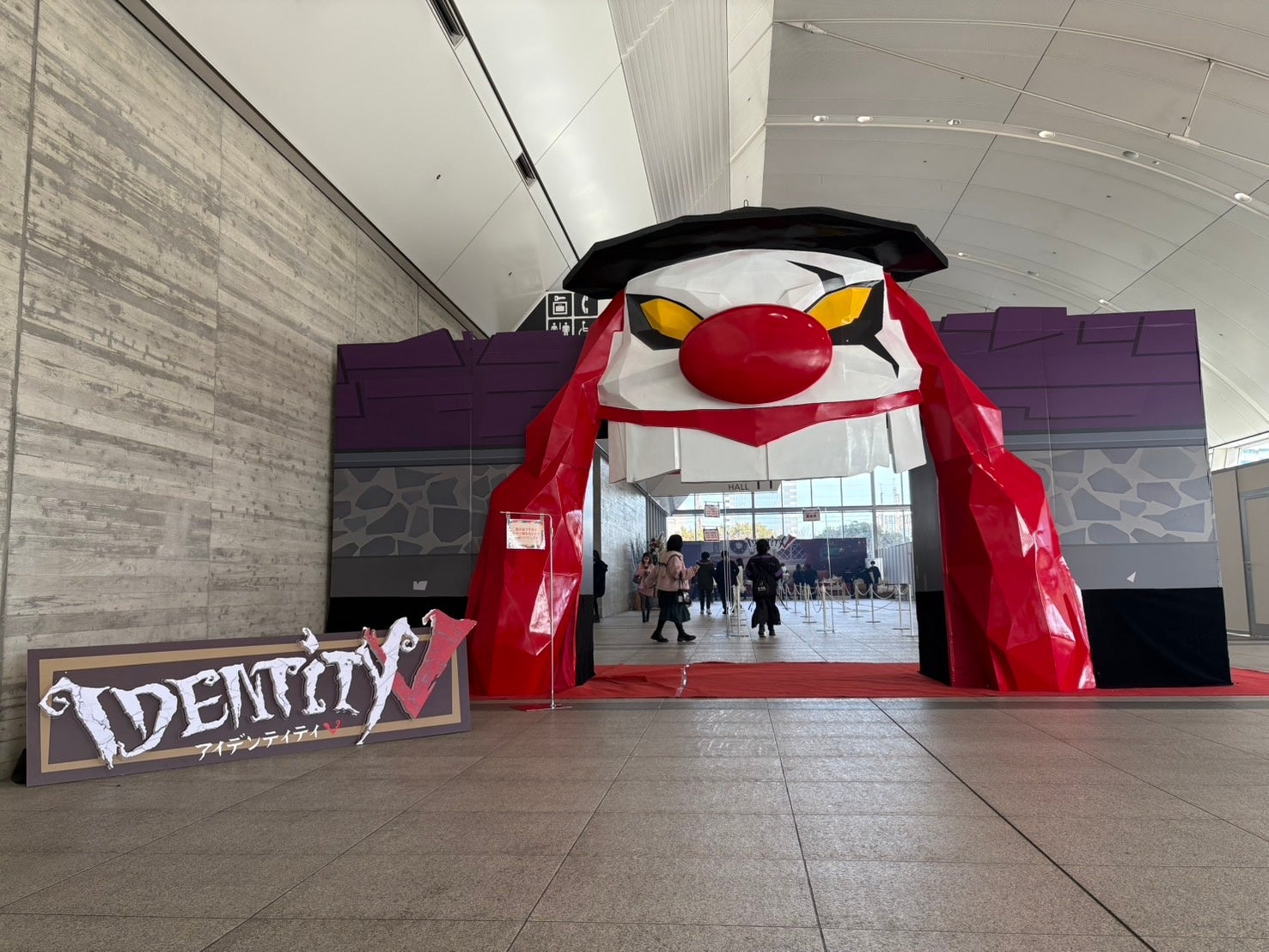 夏の6周年イベントに続き、年末もオフラインイベントを実施する『第五人格』。今回はクリスマスをイメージしたイベントとなっており、大きく分けて物販やフォトスポットをメインにしたマーケットエリアと「秋季IJL 決勝戦」が行われるesportsステージ&観戦エリアが用意されています。入口では大きなピエロのゲートが来場者をお出迎え。受付を済ませてホールに降りると、そこは『第五人格』の世界が広がっていました。