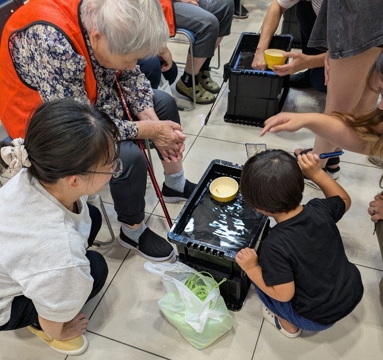 イベントでは、認知症のシンボルカラーであるオレンジ色のメダカすくいを実施。常滑市内にある「愛の家グループホーム」3事業所のご利用者が店員となり、地域の子どもたちやその親御さんたちと交流を深めました。