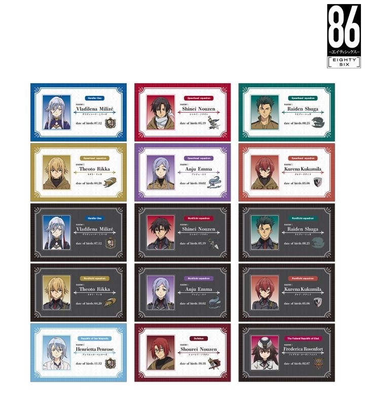 ヴラディレーナ・ミリーゼ、シンエイ・ノウゼン、ライデン・シュガ、セオト・リッカ、アンジュ・エマ、クレナ・ククミラ、アンリエッタ・ペンローズ、ショーレイ・ノウゼン、フレデリカ・ローゼンフォルトのイラストを隊員証風デザインのカードに仕上げました。