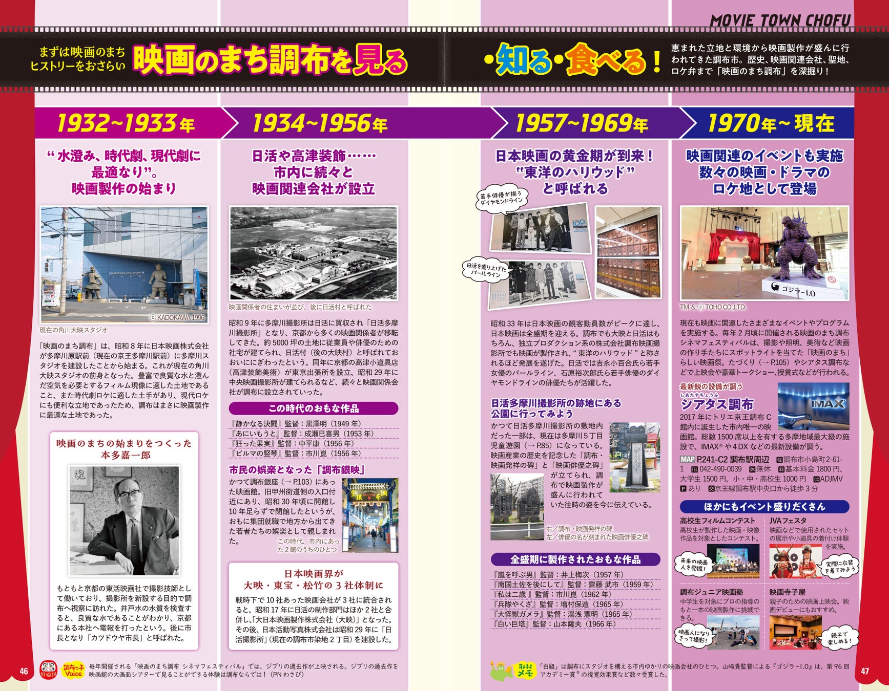 深大寺完全ガイド/調布のプロスポーツを応援/調布を愛するあの人にインタビュー/調布愛あふれるメディアが語る! 特別座談会 映画のまち調布を見る・知る・食べる!/水木しげるが暮らした鬼太郎ゆかりの地/名物商店街グルメバトン 調布ゆかりの企業を大調査!/調布から宇宙へ! JAXA 調布航空宇宙センター/市民に愛される調布の本屋さん/個性派銭湯で癒やされる/QOL爆上がりタウン調布市