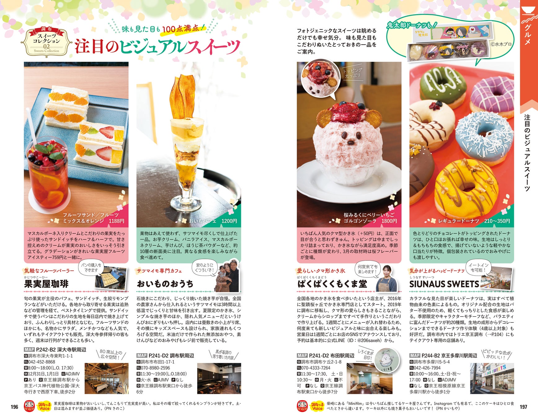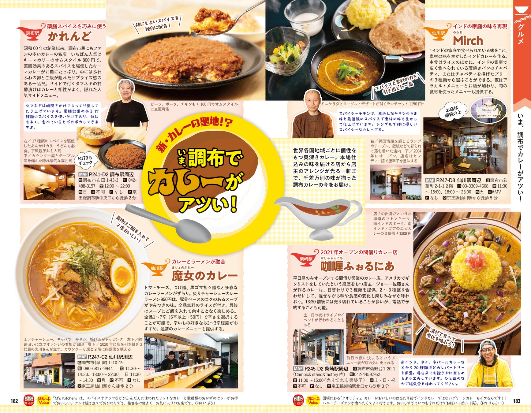 味よしコスパよしの駅近ランチ必食店/ハレの日に行きたい美食案内/料理×建物を味わう 名建築レストラン/ラーメン&うどん店大集合/異国グルメ食べつくしツアー/個性際立つカフェ巡り/調布で愛される3ツ星ベーカリー/百花繚乱! 和&洋スイーツ/オリジナルクラフトビールで乾杯!/大衆酒場で調布の夜を大満喫