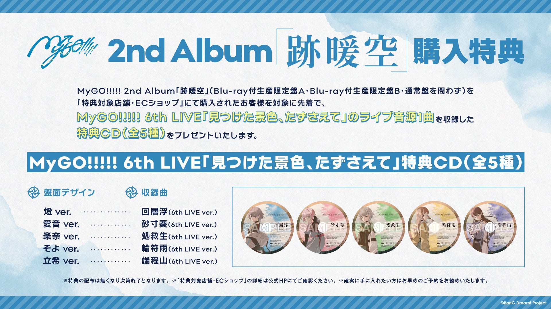MyGO!!!!! 2nd Album「跡暖空」(Blu-ray付生産限定盤A・Blu-ray付生産限定盤B・通常盤を問わず)を「特典対象店舗・ECショップ」にて購入されたお客様を対象に先着で、「特典CD」(全5種)をプレゼントいたします。
