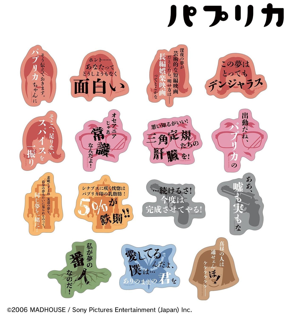 千葉敦子、パプリカ、島寅太朗、時田浩作、粉川利美、乾精次郎、小山内守雄、氷室啓の描き起こしモチーフと印象的なセリフを、ステッカーに仕上げました。