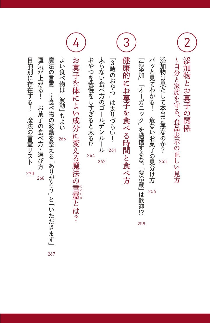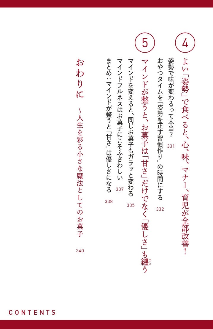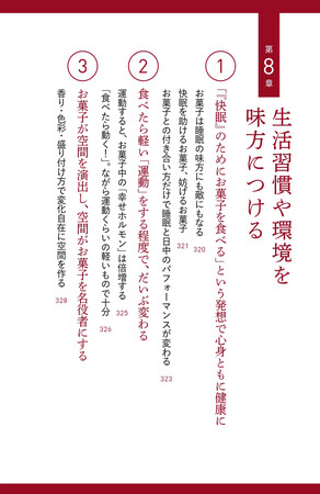 また、自身が体調を崩したことをきっかけに、お菓子が心と身体に与える効果を実感。お菓子を美味しく正しく食べて、健康になる方法も発信しています。そこで本書では、食べ方や素材の選び方といった健康面にも言及し、「お菓子=不健康」という誤解を解く内容も紹介。カロリーや糖質制限にとらわれず、正しく食べて心身を整える知識を伝えます。
