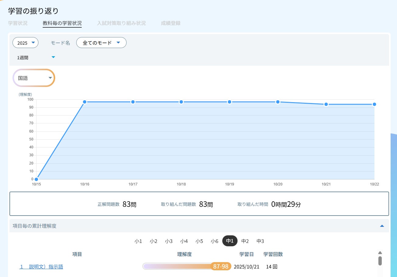 キミノスタディでは、正答率の他に”理解度”という指標を設けています。