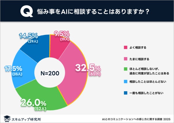 悩み事をAIに「よく相談する」人は9.5%、「たまに相談する」人は32.5%で、合わせて42%が相談経験ありと回答した。